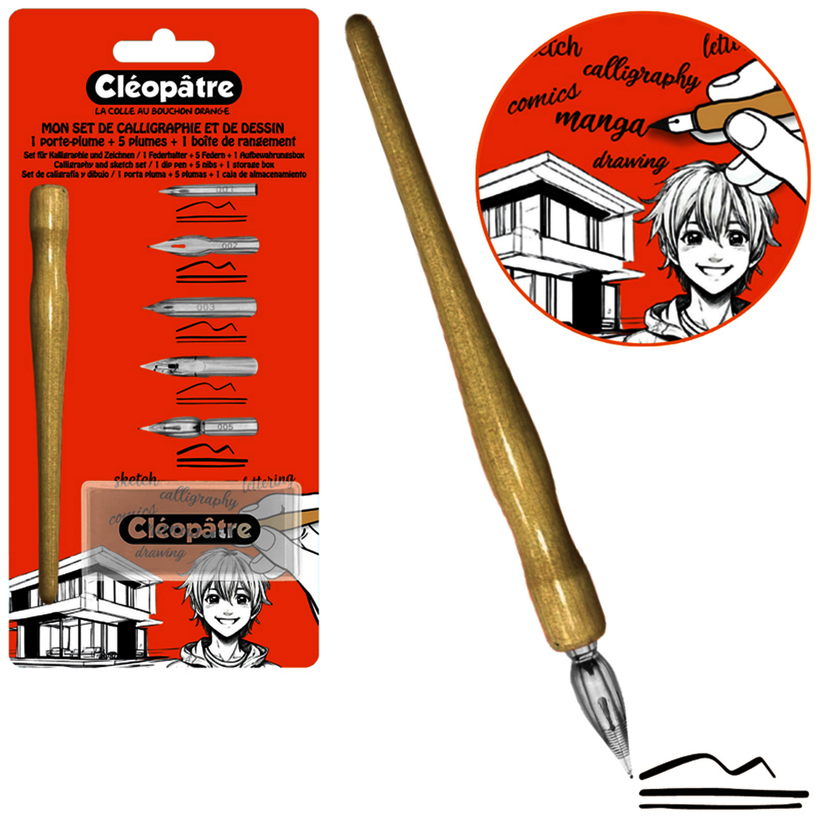 Ensemble porte-plume en bois et de plumes acier pour explorations graphiques en classe. Id?al pour initier ?l?ves ? la calligraphie, dessin et lettrage. Bo?te de rangement incluse.
