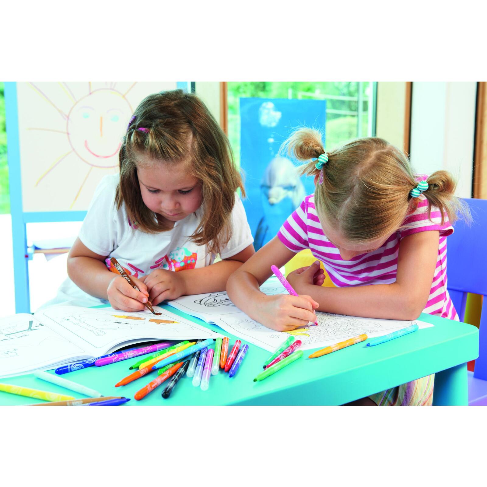 Capuchon ventilé - Encre lavable - Couleurs éclatantes pendant 8 semaine grâce à une encre spéciale, la pointe ne sèche pas, même si on oublie de remettre capuchon - Pointe moyenne bloquée - Largeur d’écriture : 2 mm.La recharge de 12