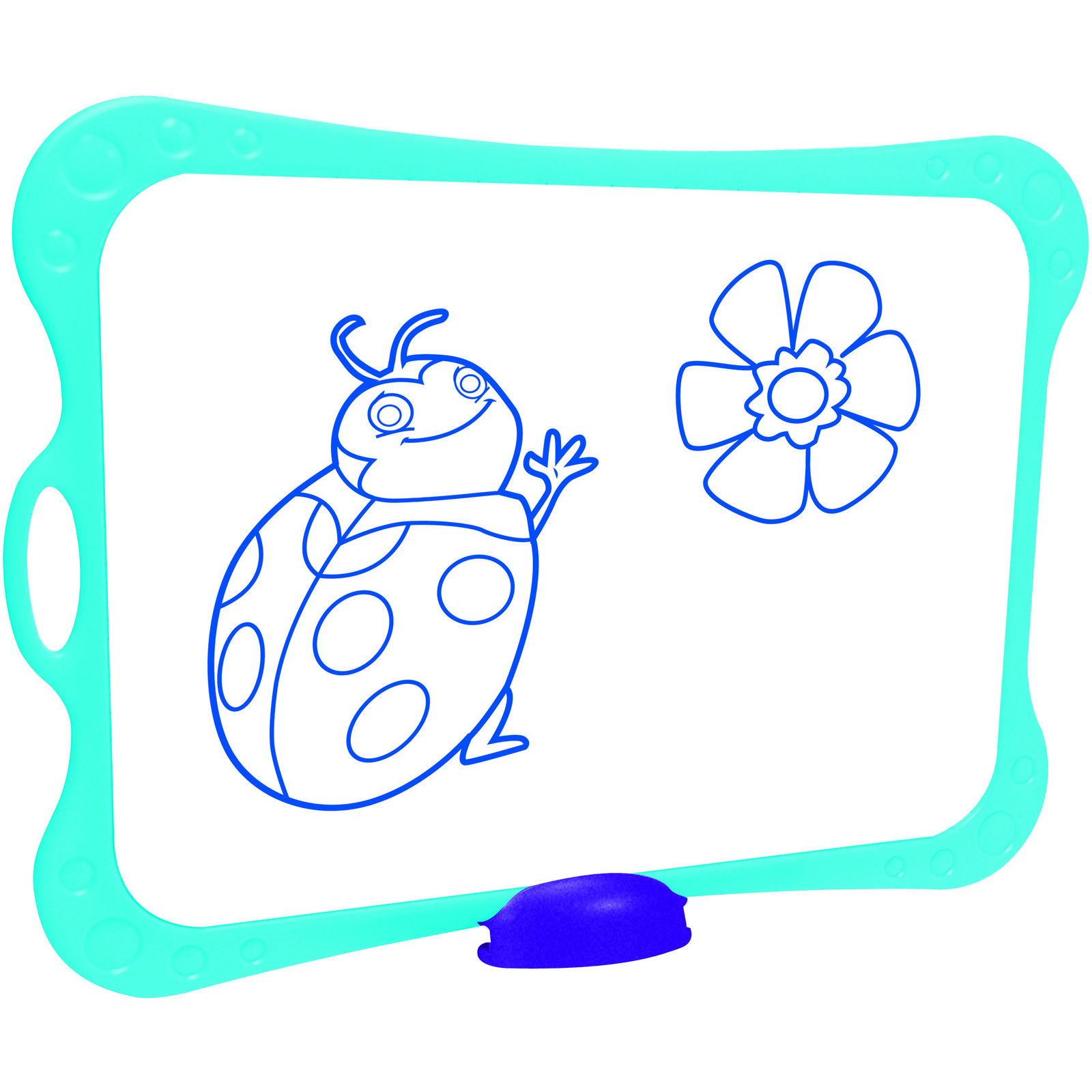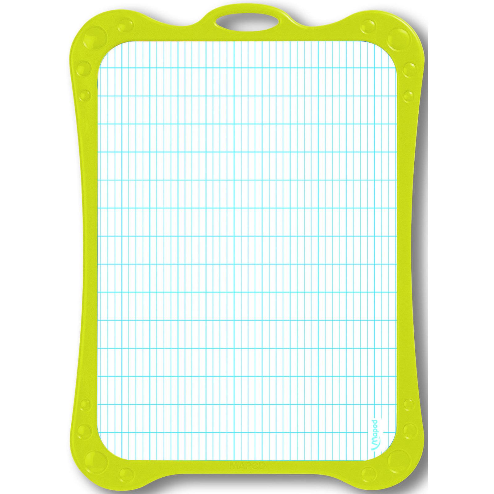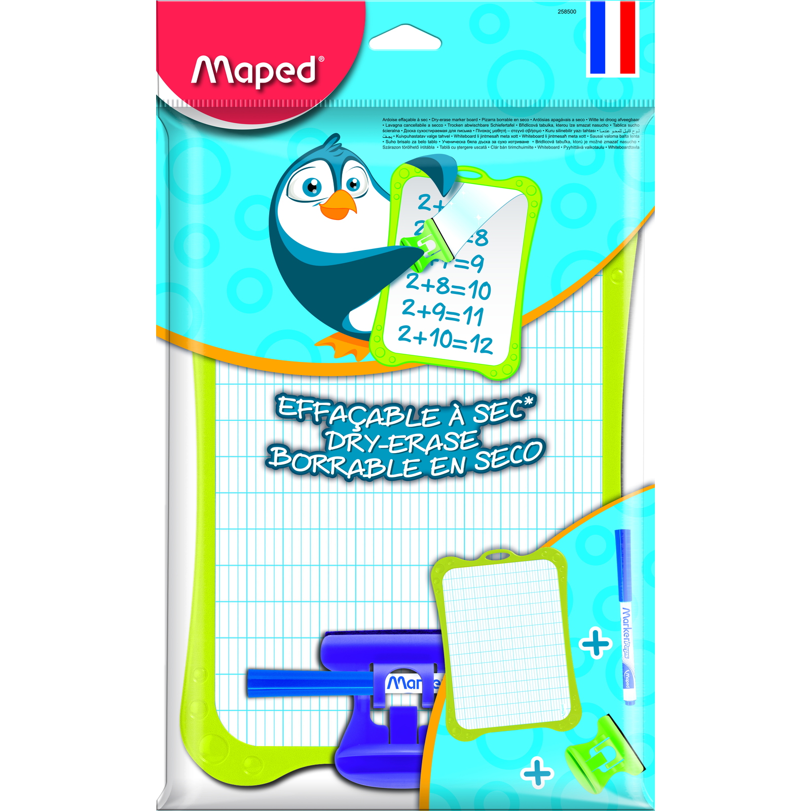 1 face unie pour le dessin, 1 face quadrillée séyès pour l’écriture. Incassable et ultra-propre. 1 porte-accessoires, 1 brosse, 1 feutre effaçable à sec bleu. Matière recyclé.Format : 20 x 28 cm