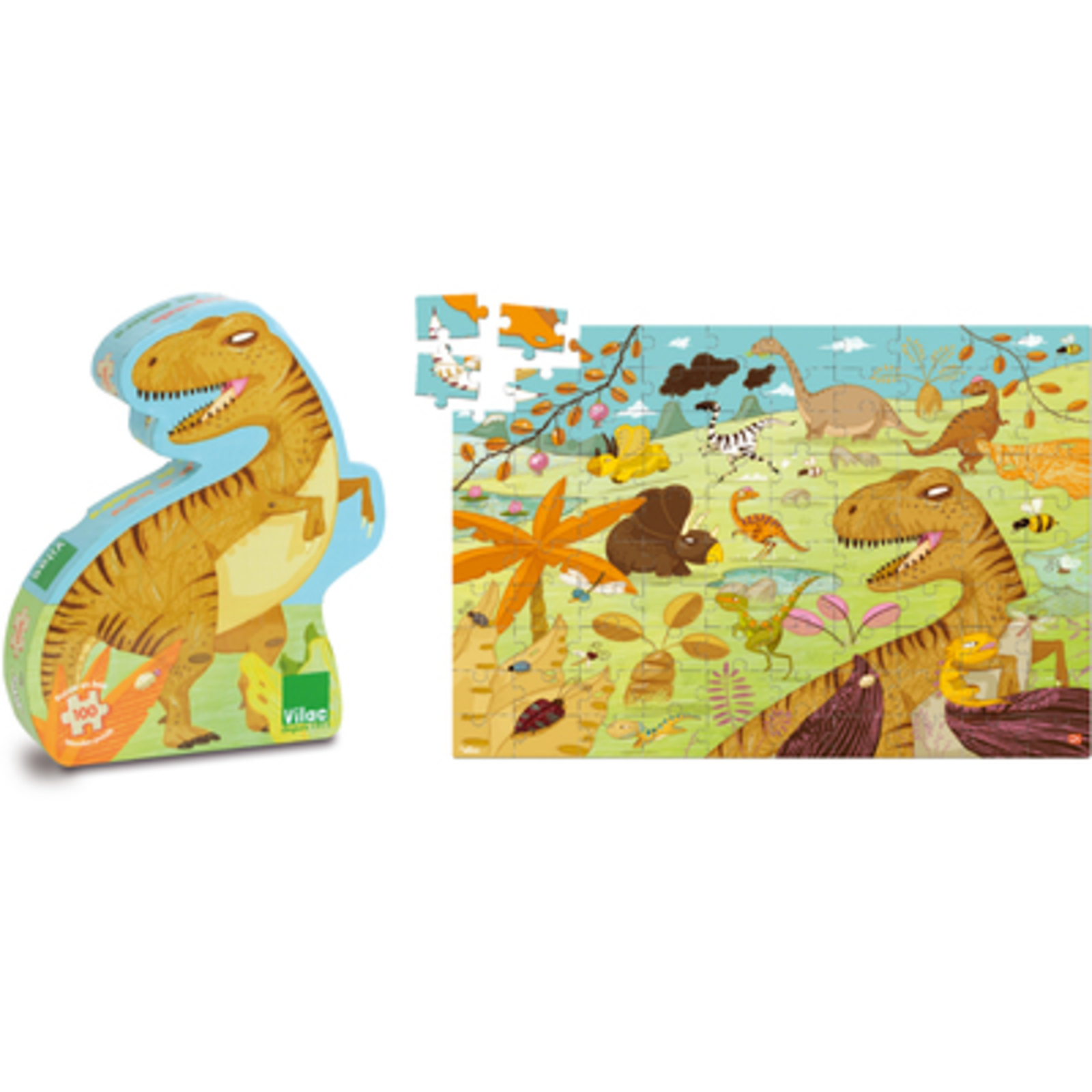 Un beau puzzle en bois de 100 pièces sur le thème des dinosaures signé Vilac. La persévérance des enfants leur permettra de découvrir une jolie fresque préhistorique mettant en scène de nombreuses espèces de dinosaures. 100 pièces en bois. Dim. puzzle (L x l) : 45 x 30 cm. A partir de 5 ans.