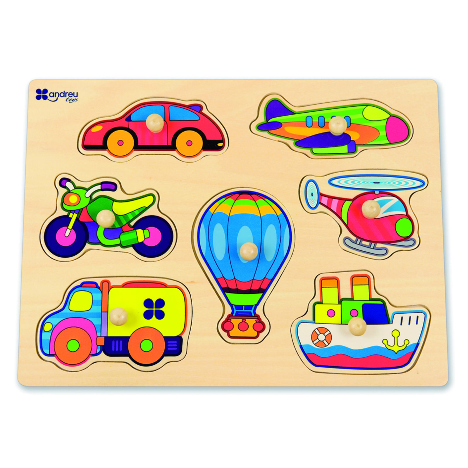 Encastrements à boutons sur le thème des véhicules de chantier. Les silhouettes des engins sont dessinées sur le fond du support. Contenu : 9 pièces et 1 support en bois Dim du puzzle (L x l) : 30 x 30 cm