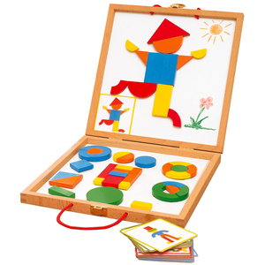 Des pièces en bois aimantées et des cartes modèles pour s’amuser à reproduire toutes sortes de formes : personnages, animaux, véhicules… Contenu : 1 support en bois, 42 pièces en bois et 24 fiches modèles