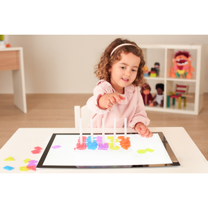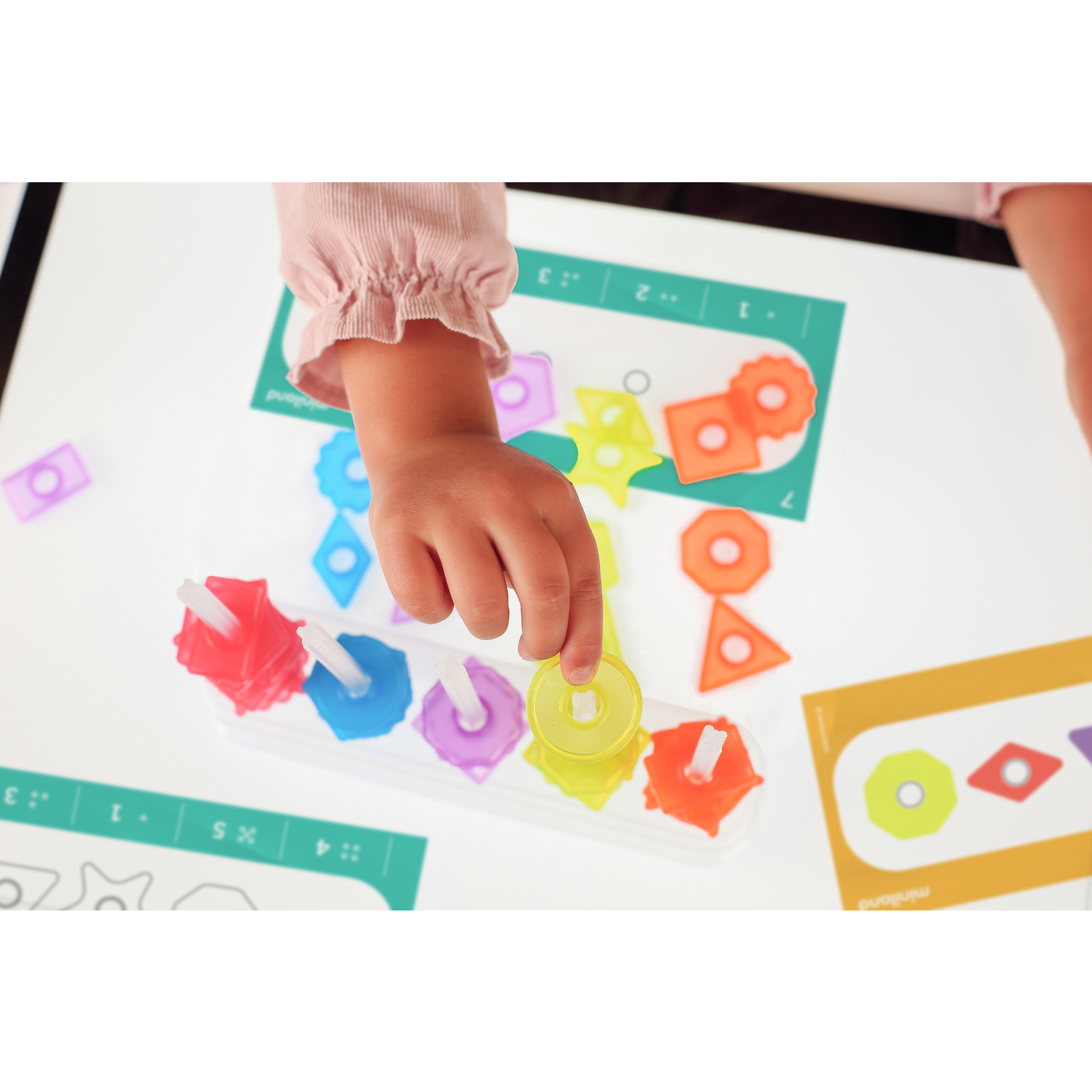 Ce boulier en plastique translucide dispose d'une base à 5 colonnes et de 50 pièces de différentes couleurs et formes. Un matériau amusant et utile, il fournit un apprentissage pratique qui fonctionne sur les compétences de classification et de sérialisation des enfants. Il est livré avec des feuilles d'activité transparentes avec des niveaux de difficulté croissants, qui peuvent être utilisées sur des tables lumineuses.Contenu : 50 formes, 1 boulier, 2 lacets, 14 cartes de jeu transparentes et 1 brochure