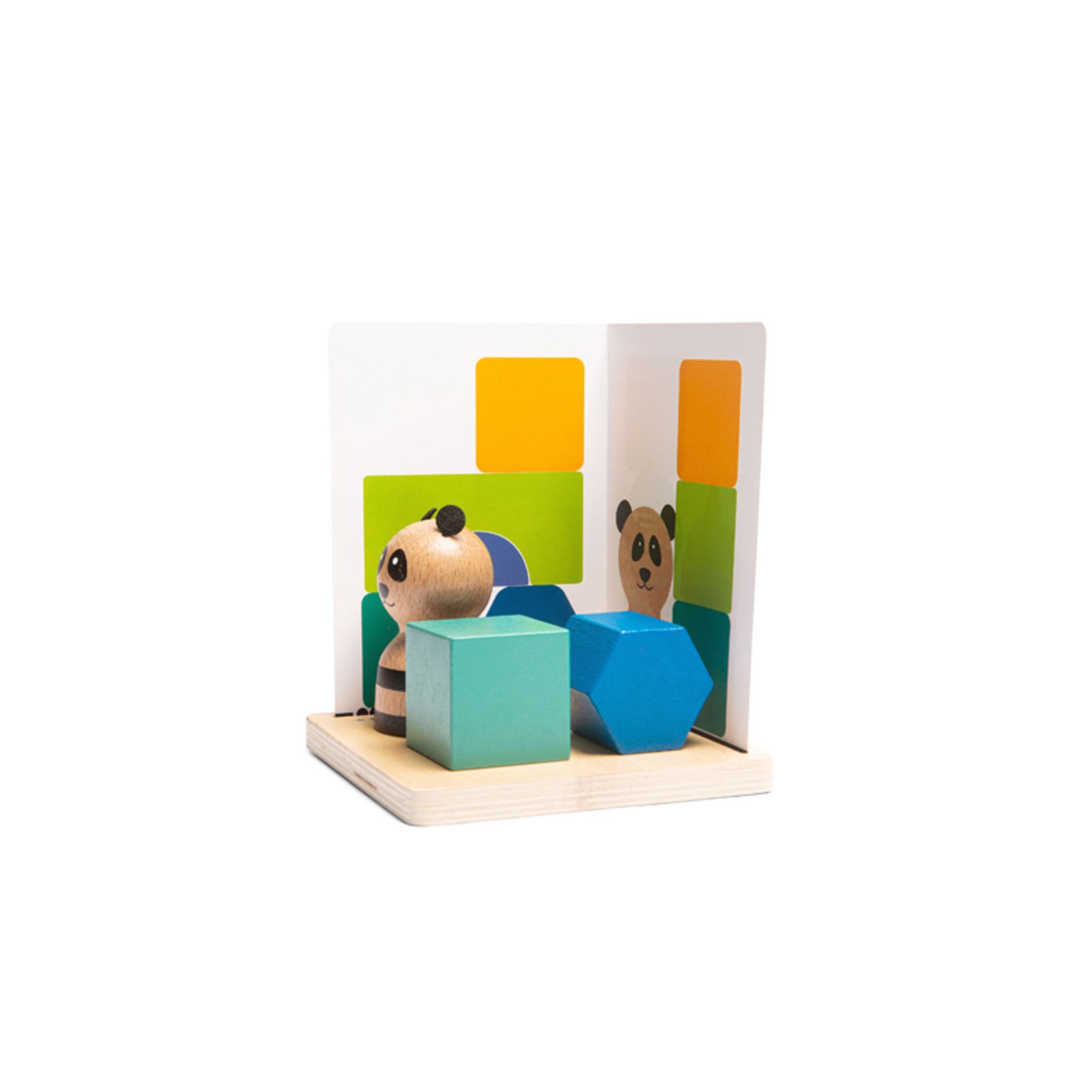 Ce panda effronté aime se cacher. Pouvez-vous voir où il est ? Placez-le ainsi que toutes les pièces au même endroit que la carte. Assurez-vous de regarder au niveau des yeux et de tous les côtés.Contenu : 1 panda, 7 pièces, 1 support en bois et 10 cartes modèle recto versoIdéal pour travailler la double symétrie