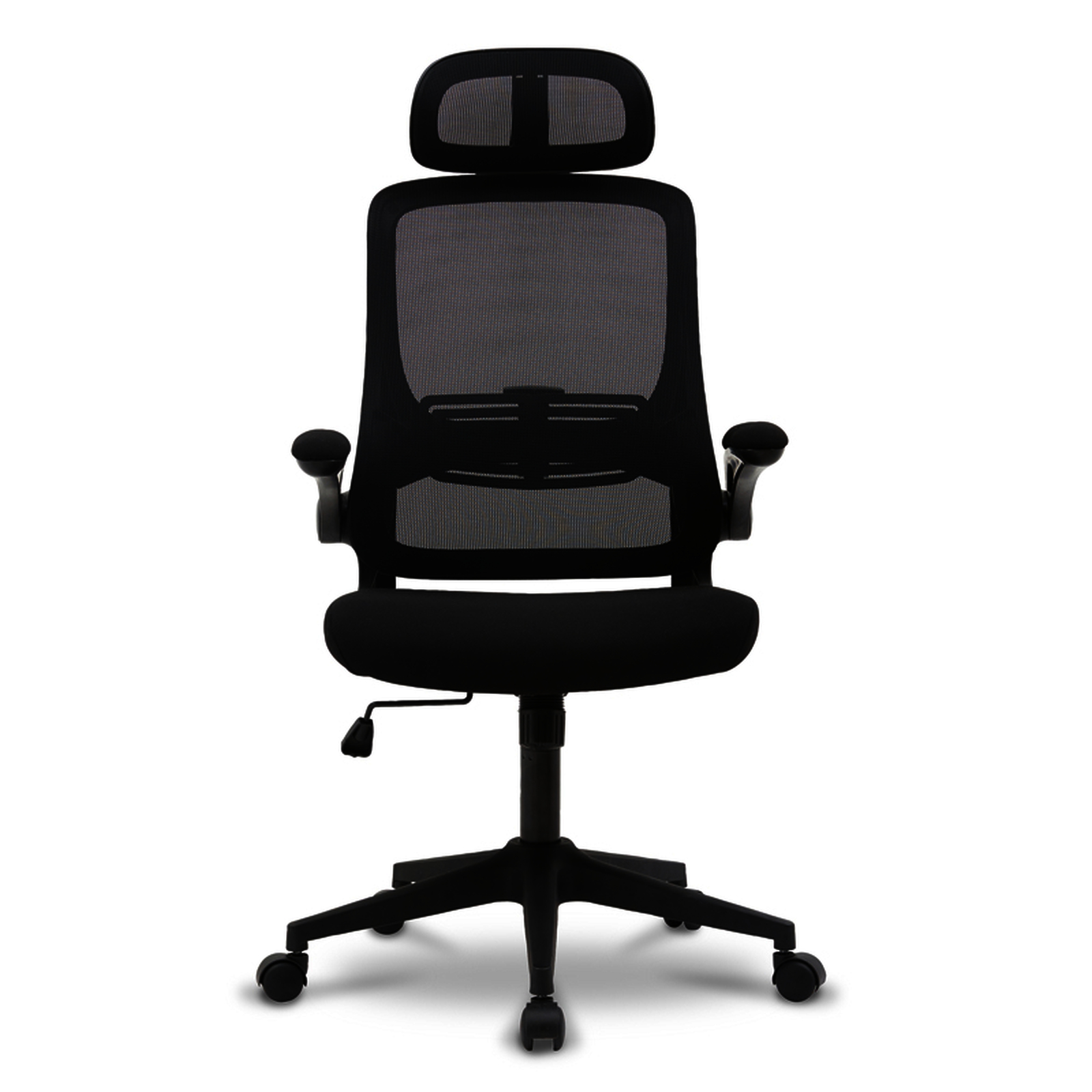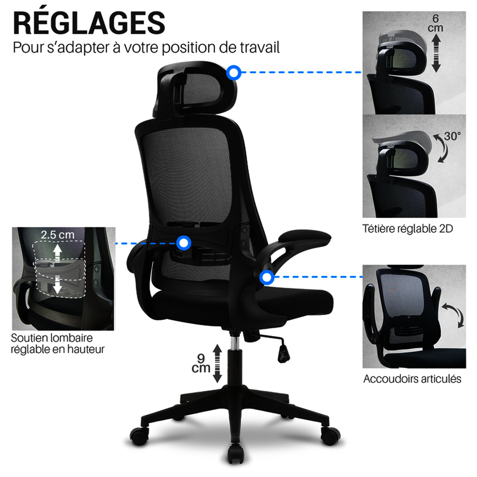 Fauteuil rotatif ? 360?. Recouvert en maille et en tissu de couleur noire. R?glage en hauteur de l'assise. Appui-t?te et dossier ajustables ind?pendemment. Accoudoirs ajustables en polypropyl?ne. Base solide et r?sistante en acier chrom?. 5 roues en nylon de 6 cm de diam?tre. Usage r?gulier : de 5 ? 8 heures par jour. Poids maximum : 200 kg. Dimensions : 1180 + 100 x 630 x 625 mm. Poids fauteuil : 12,4 kg.