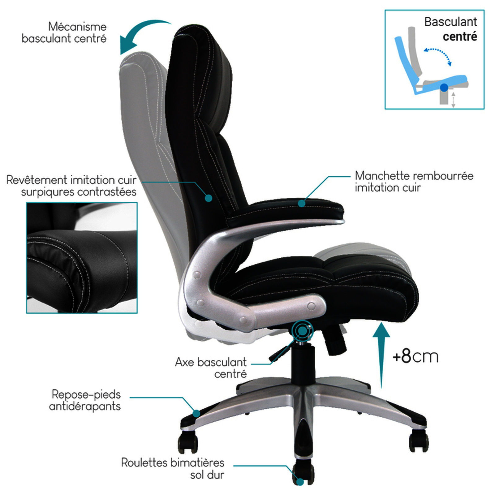 R?gulation de la hauteur par pneumatique. M?canisme d?synchronis? : le dossier et le si?ge s'adaptent ind?pendamment aux mouvements de la personne assise. 5 roues en nylon ? 6 cm. En imitation cuir noir et maille. Base solide et robuste en acier chrom?. Accoudoirs fixes en polypropyl?ne. Convient, pour une hauteur d'assise optimale, aux personnes mesurant de 185 cm ? 205 cm. Poids maximum support? : 130 kg. Usage r?gulier : de 5 ? 8 heures par jour. Dimensions : 1110 + 100 x 610 x 640 mm. Poids : 12,6 kg.