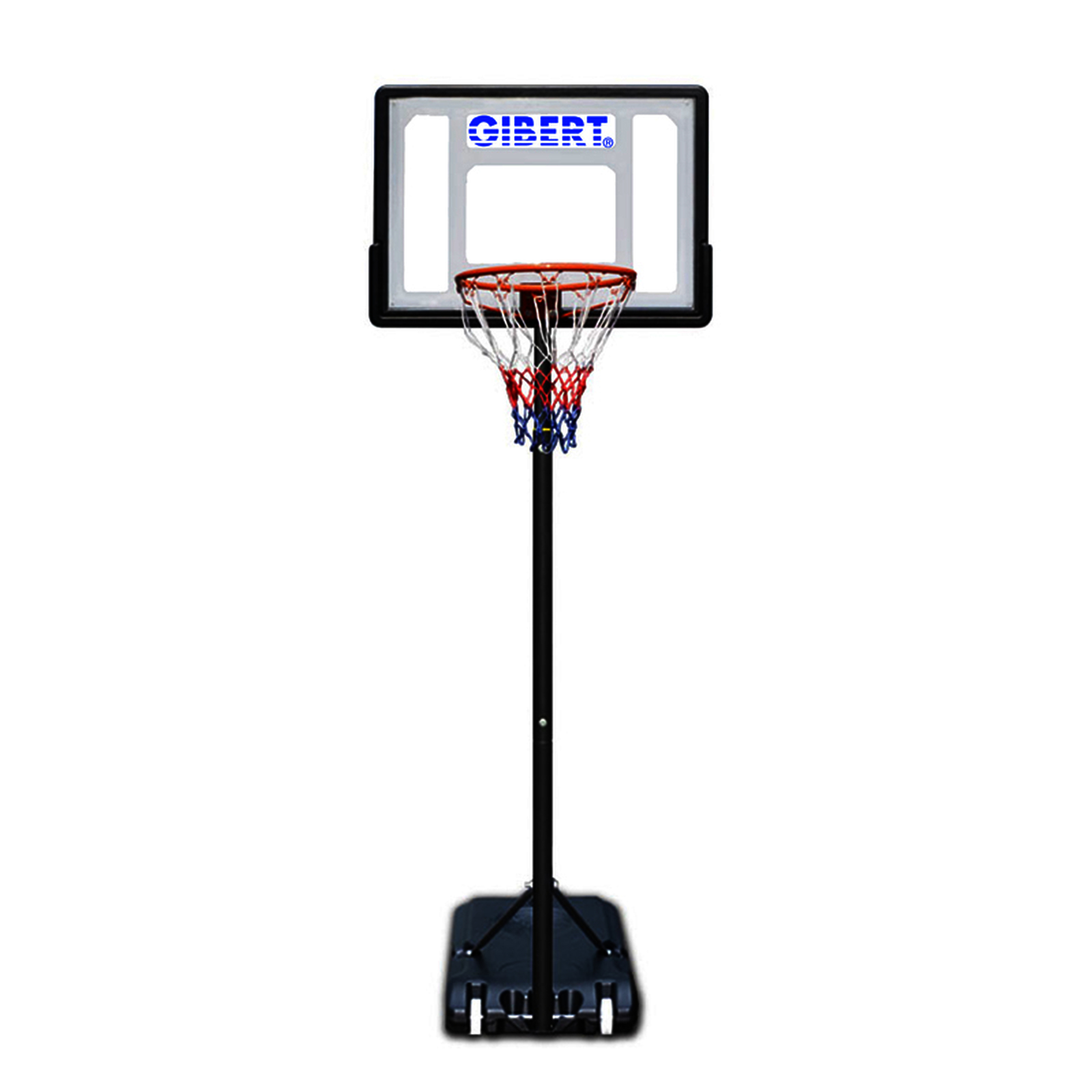 Compos? d?une base ? lester avec sable et eau ?quip?e de 2 roulettes pour faciliter le d?placement, un poteau en tube m?tal avec hauteur adaptable de 1,60 / 2,10 m, un panneau avec cercle m?tal et filet. Usage uniquement sous la responsabilit? d?un adulte.